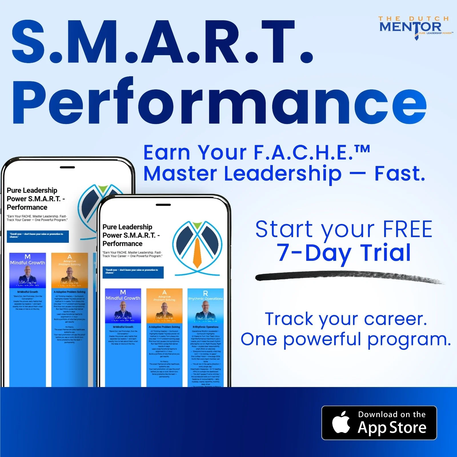 The S.M.A.R.T. Performance App is a practical leadership development platform designed for emerging and experienced professionals who want to grow intentionally without adding hours to their schedule. Built around a simple 15-minute daily rhythm, the app provides leadership tools, performance tracking, FACHE preparation resources, and guided development to help users move from reacting to leading with clarity and confidence.
